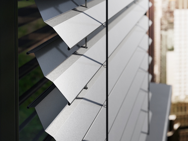 Einstellbarer Lamellenneigungswinkel sorgt für optimale Verdunkelung des Innenraumes und reguliert den Sonnenwärmedurchgang des Gebäudes. Außerdem dienen die Außenjalousien als zusätzliche Schalldämpfung.