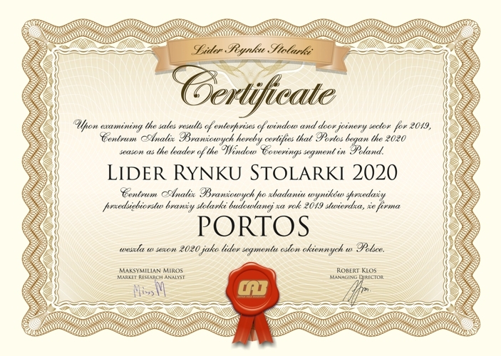 Szanowni Państwo, w imieniu połączonych zespołów Forum Branżowego oraz Centrum Analiz Branżowych, ale też w imieniu setek uczestników Ogólnopolskiego Forum Stolarki 2020, serdecznie Państwu gratuluję pozycji Lidera Rynku Stolarku w segmencie osłon okiennych i składam życzenia kolejnych sukcesów w mijającym roku. Proszę o przyjęcie pamiątkowego dyplomu, będącego wyrazem najwyższego uznania dla kadry kierowniczej i całego zespołu pracowniczego Waszego przedsiębiorstwa.